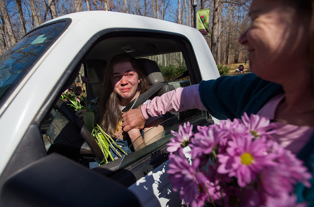 Alum Terry Evans (right) consoles junior Katy Drew as the Sweet Briar community welcomes back their students from spring break in Amherst, Va. Sweet Briar announced that the college would close in August due to financial issues. (Autumn Parry/The News & Advance)