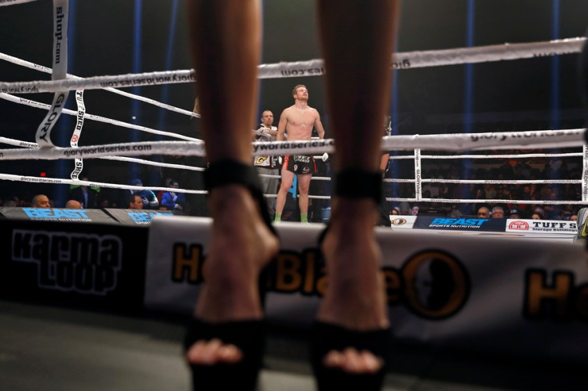 Robert Thomas waits inside the ring in between rounds as women carrying cardboard numbers to identify the current round pass by before the start of the match against Joe Schilling during Friday’s co-headline event presented by Glory Sports International at the Hampton Coliseum. (Jonathon Gruenke/Daily Press)