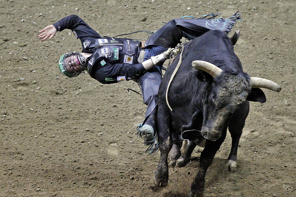MULTIPLE – 3rd Place (Jonathon Gruenke/Daily Press) Published May 8, 2015 at 1000 × 667 in VNPA 1st Q. Clip Contest Winners Gage Gay hangs onto bull, Freaks Yet, while competing in the Pro Bull Riders Blue DEF Velocity Tour at the Hampton Coliseum Saturday evening. (Jonathon Gruenke/Daily Press)