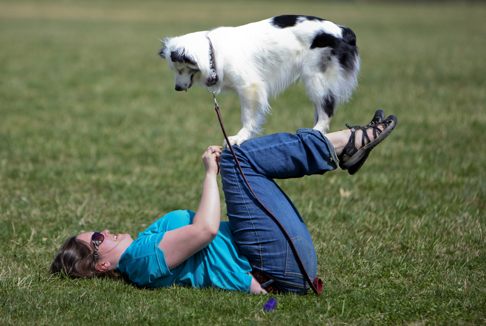 “Echo,” a three-year-old miniature Australian Shepherd, practices some agility with owner and trainer, Katie Baker of Christiansburg who started her own business, “the K9Mind” after working as a trainer at Pet Smart. They had competed in the weekend Star City K-9 Agility event and were hanging out in the grass at Green Hill Park on Sunday. Baker said Echo did well in competition until she ran out of the ring in the last event. (Stephanie Klein-Davis/The Roanoke Times)