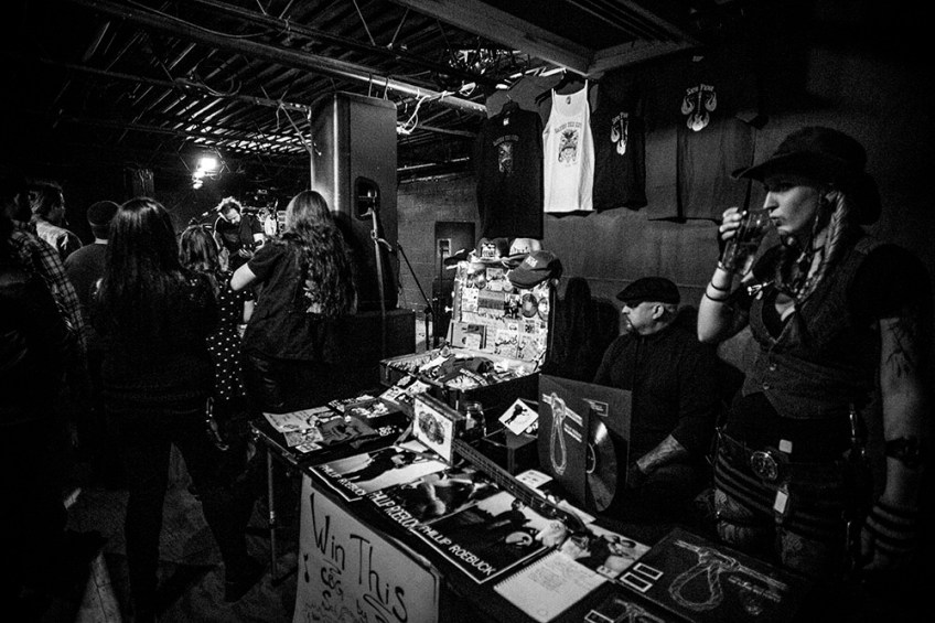 Phoenix Roebuck sips a drink at the merchandise table while her husband Phillip Roebuck performs at The Riff House on Thursday, Nov. 20, 2014 in Chesapeake, Va. The venue is known for having hard rock and heavy metal acts, but is hosting an “Americana Night” this evening. (Photo by Jay Westcott/Zuma Press)