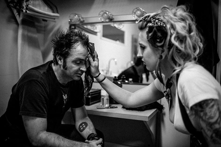 Phillip Roebuck, left, is comforted by his Phoenix after performing at a benefit concert at the Paramount Theater on Sunday, March 23, 2014 in Charlottesville, Va. Something Roebuck ate didn’t agree with him and made him sick. (Photo by Jay Westcott/Zuma Press)