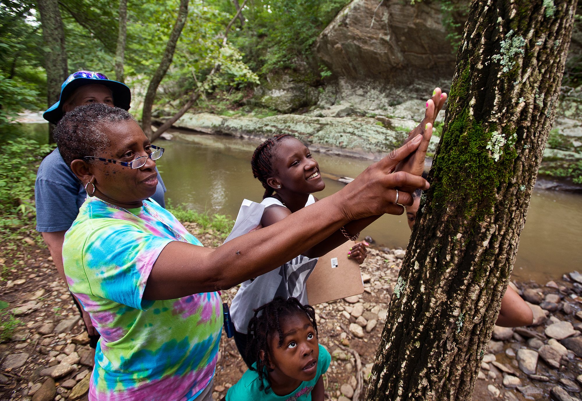 –Feature Picture Story HM: Autumn Parry/The News& Advance–Promise Guy, 13, is encouraged by her host mother Barbara Austin to touch moss on a tree, while on a scavenger hunt in the woods at Claytor Natures Study Center in Bedford, Va. “I’m not built for this,” said Promise as she ventured on the nature walk with her host family. This is Promise’s fourth year participating in The Fresh Air Fund of New York City, which sends thousands of children to rural homes every year so they can experience life outside the city.