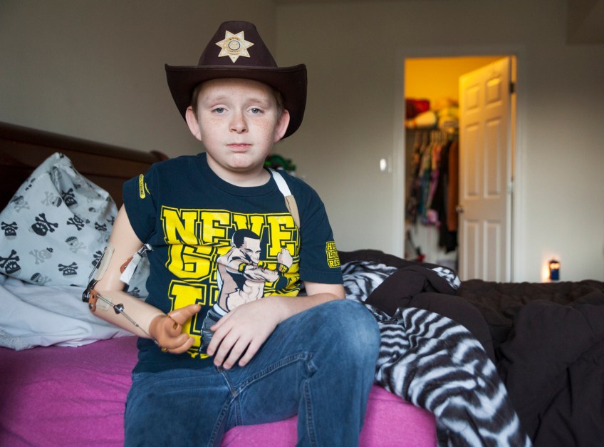 –Feature Picture Story 3rd Place: Griffin Moores/The News-Leader–Matthew Mitchell sits for a picture in his room wearing his prosthetic arm. Although the arm is intended to aid in completing everyday tasks his mom Lori Mitchell describes it more as a hinderance for the 11-year-old.
