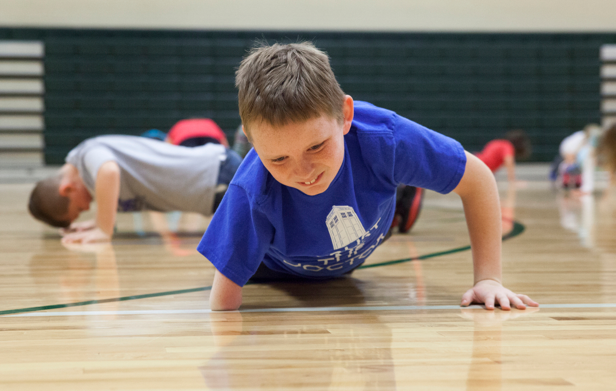 Matthew struggles through a round of pushups during gym class at Wilson Elementary School. Hunter Ingersoll, Matthew’s P.E. teacher, says he admires the 10-year-old’s spirit and unwillingness to use his disability as an out for difficult activities. “IÕve never seen the kid when he wasnÕt smiling and it really made me feel good for him to come in and try whatever we were doing,” Ingersoll said.