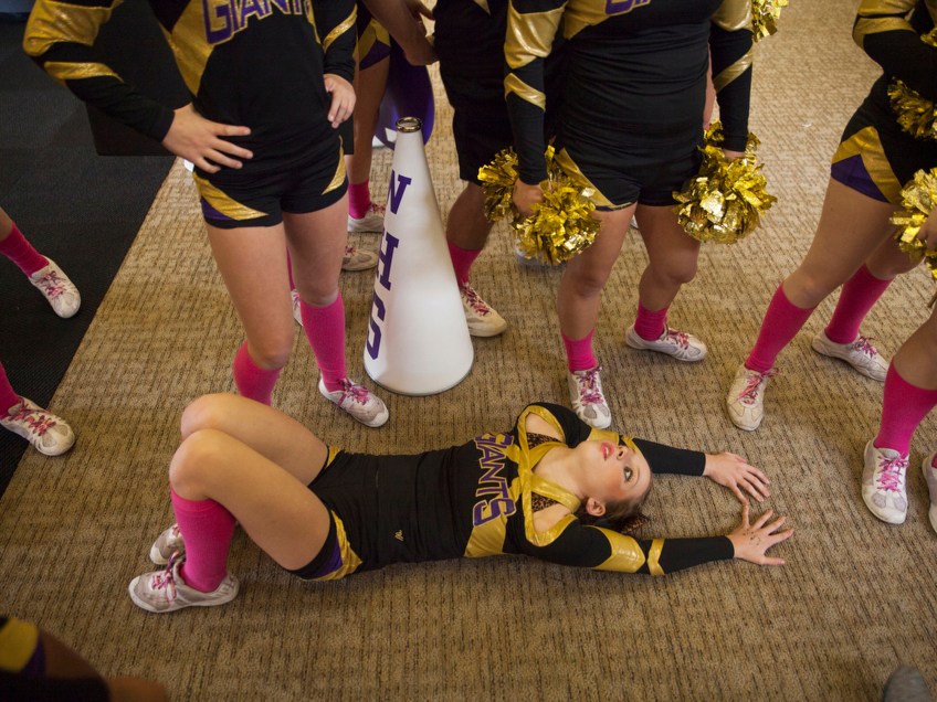 –News Picture Story 1st Place: Griffin Moores/The News-Leader– “Cheer” Waynesboro High School’s Sonny Carey stretches her arms on the ground in preparation for the team’s cheerleading state championship performance in Richmond on Nov. 8, 2014.
