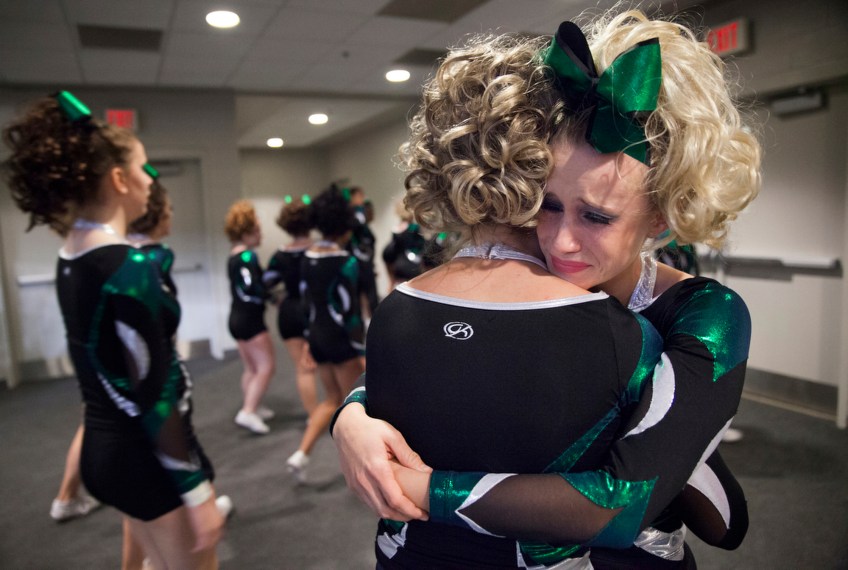 Kelsey Sims, right, a senior on Wilson Memorial High School’s cheerleading team, embraces her classmate Taylor Bailey moments after completing their Group 2A state championship winning performance in Richmond on Nov. 8, 2014. “It’s the best and worst feeling I’ve ever felt in my life,” said Sims, describing the final performance as perfect but bittersweet as it is her last with the team.