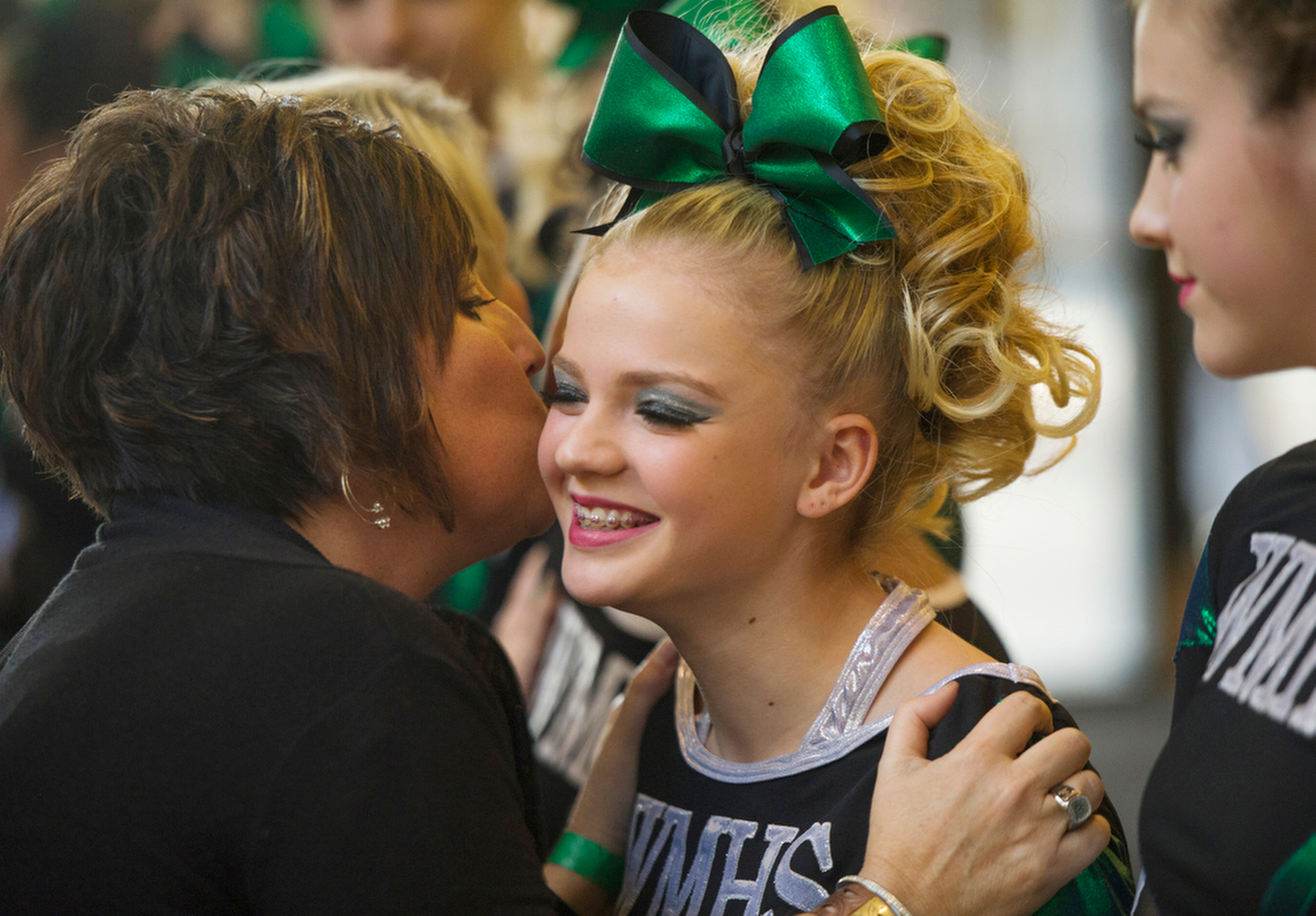 Cheer Published June 1, 2015 at 2000 × 1392 in THE 2014 VNPA PHOTO CONTEST WINNERS GALLERY: News Picture Story Wilson Memorial High School cheerleading coach Renae Bailey, left, gives one of her athletes, Rachel VanFossen, a kiss on the cheek before their performance in the Group 2A cheerleading championship in Richmond on Nov. 8, 2014.