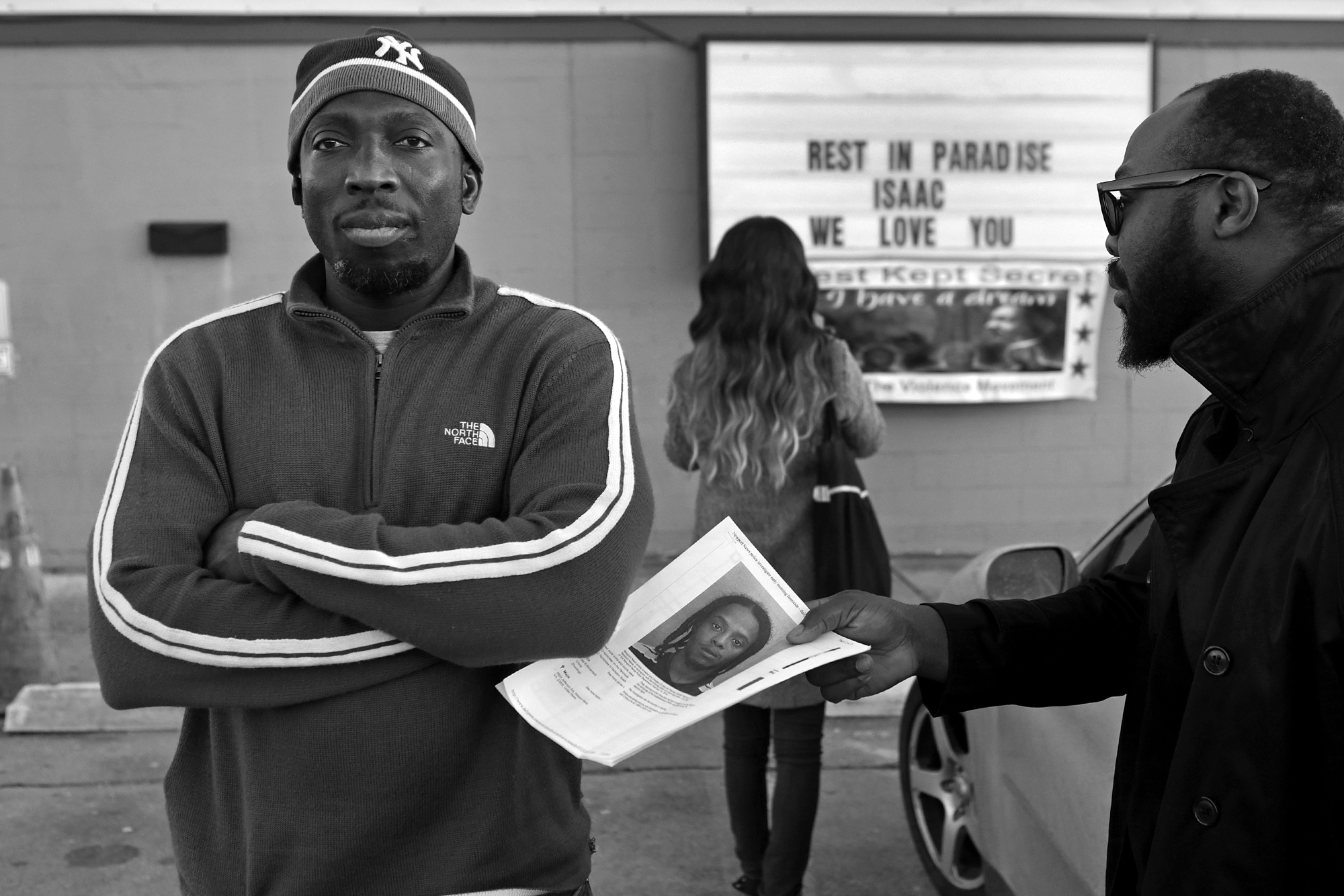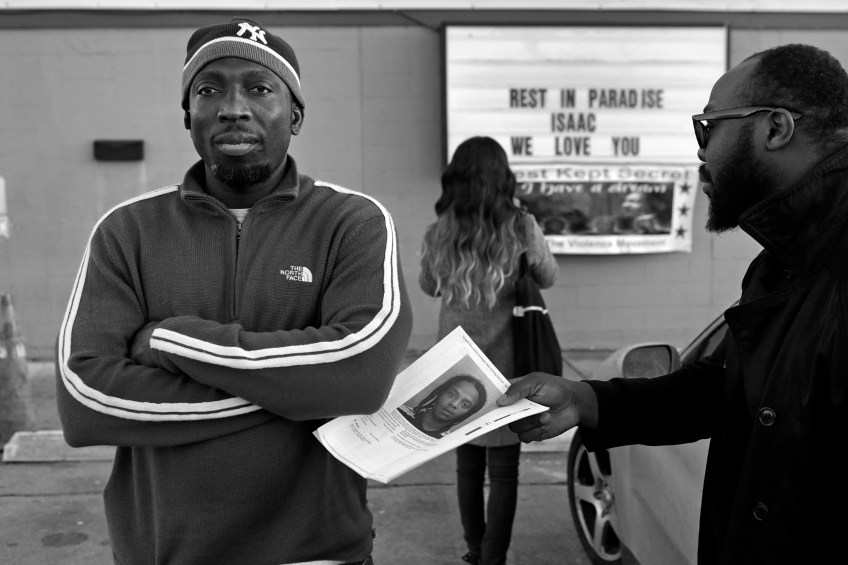 –News Picture Story 2nd Place: Jonathon Gruneke/Daily Press–Monsur Dawodu, left, stares off into the distance as Jide Oshin, right, hands back the mugshot of Rashad D’Antrell Ashlock, a 20-year-old who has been arrested and charged in connection with the death of Jide’s father, Isaac Oshin, owner of Majik City Gentlemen’s Club and Sports Bar. Dozens of people gathered outside the club Friday evening for a vigil to remember Isaac Oshin. Oshin was shot to death Wednesday evening inside the club at 5825 Jefferson Ave.