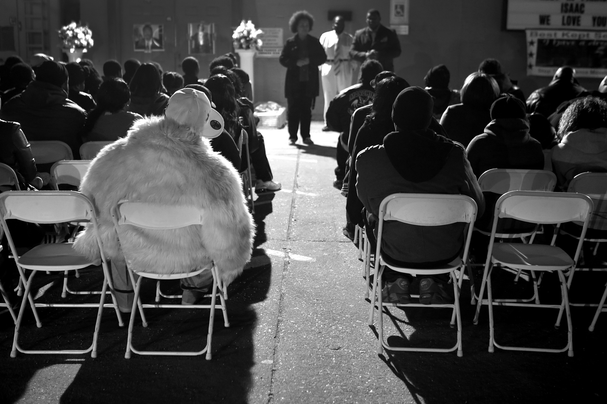 Friends and family listen during a vigil for Isaac Oshin outside Majik City Gentlemen’s Club and Sports Bar Friday evening. Dozens of people gathered outside the club to remember Isaac Oshin who was shot to death inside the club at 5825 Jefferson Avenue Wednesday evening.