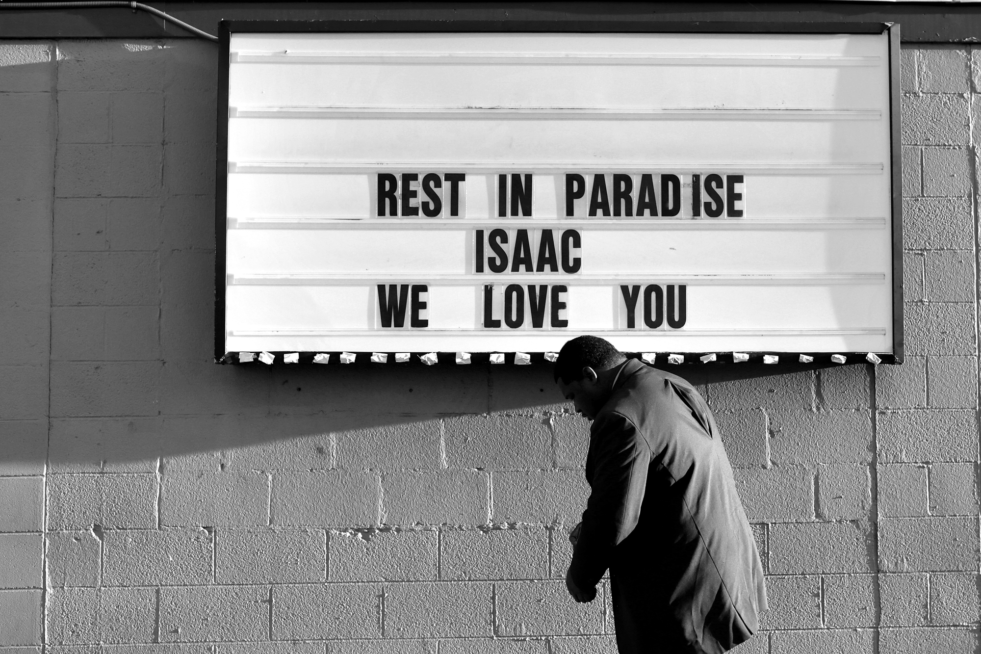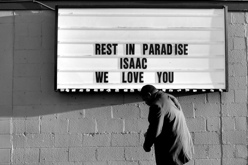 Terry Riddick walks past a sign during Friday evening’s vigil for Isaac Oshin outside Majik City Gentlemen’s Club and Sports Bar Friday evening. Dozens of people gathered outside the club to remember Isaac Oshin who was shot to death inside the club at 5825 Jefferson Avenue Wednesday evening.