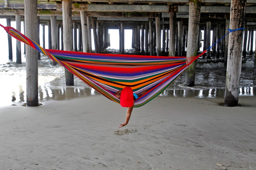 Feature 1st Place: Jonathon Gruenke/Daily Press Published June 1, 2015 at 2000 × 1333 in The 2014 VNPA Photo Contest Winners Gallery: Singles –Feature 1st Place: Jonathon Gruenke/Daily Press– Erica Carcamo, 4, plays in the sand while laying in a hammock as waves wash ashore underneath the pier of Buckroe Beach Friday morning.