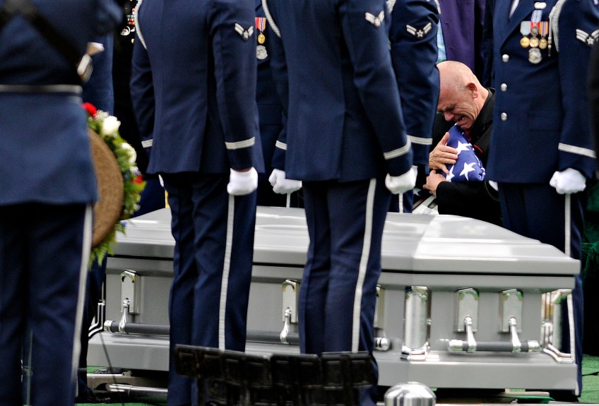 –General News 2nd Place: Mike Morones/Military Times–Steven R. Woods becomes emotional after receiving the flag for his father Army Staff Sgt. Lawrence Woods during a burial service on Friday, March 21, for seven service members who died on Oct. 24, 1964 near Bu Prang, Vietnam. The remains of Staff Sgt. Woods were recently identified though partial remains of six service members and the complete remains of an eighth crew member were recovered in 1964.
