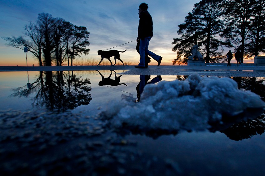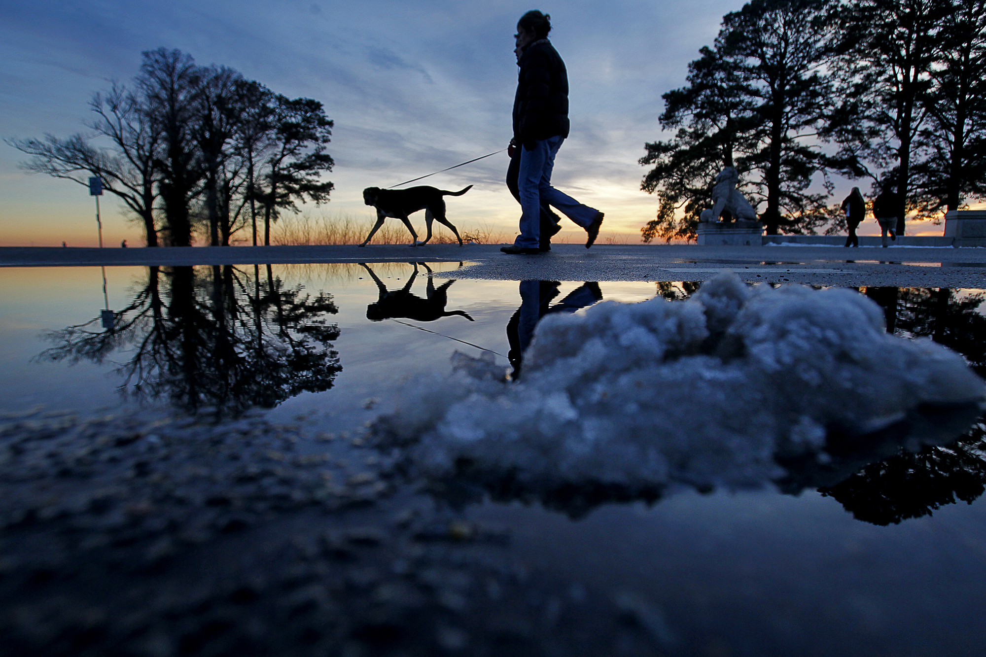 Pictorial 2nd Place: Jonathon Gruenke/Daily Press Published June 1, 2015 at 2000 × 1333 in The 2014 VNPA Photo Contest Winners Gallery: Singles –Pictorial 2nd Place: Jonathon Gruenke/Daily Press–Patrik and Camilla Lasson walk their dog Roxy as snow piles melt while the sun sets Friday evening near Lions Bridge.