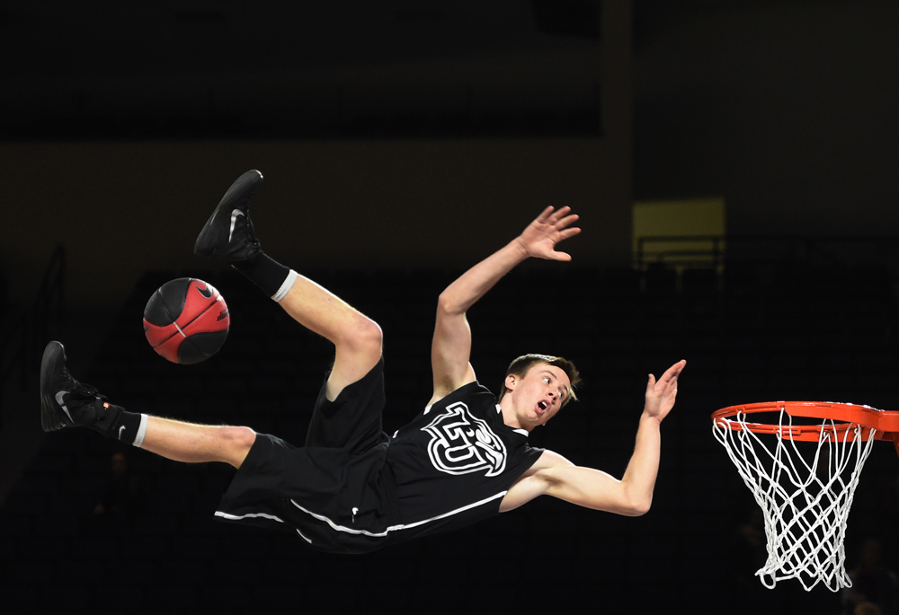 –Sports Feature HM: Max Oden/The News & Advance–Joshua Fowler, of the Liberty University S.O.A.R. Dunk Team, loses the ball between his feet as he flies through the air on a dunk attempt during halftime of a Liberty University women’s basketball game against VCU at the Vines Center. The team uses small trampolines to achieve their acrobatic dunks.