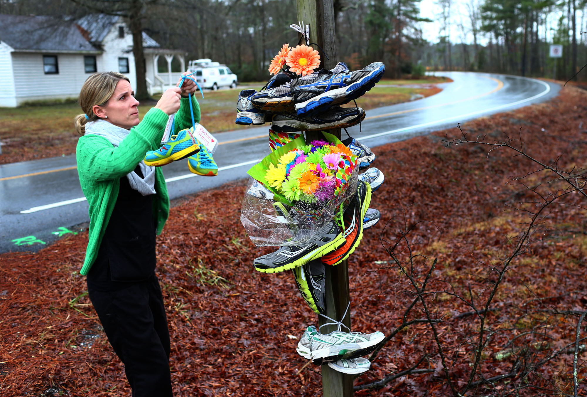 General News HM: Daniel Min/Richmond Times-Dispatch Published June 1, 2015 at 2000 × 1352 in The 2014 VNPA Photo Contest Winners Gallery: Singles Gina Junkermann places running shoes with the message of “MEG STRONG WE LOVE YOU!” at the corner of Hickory Hill Road and East Patrick Henry Road in honor of Meg Menzies, who died a day before after being struck by a car driven by a drunken driver.
