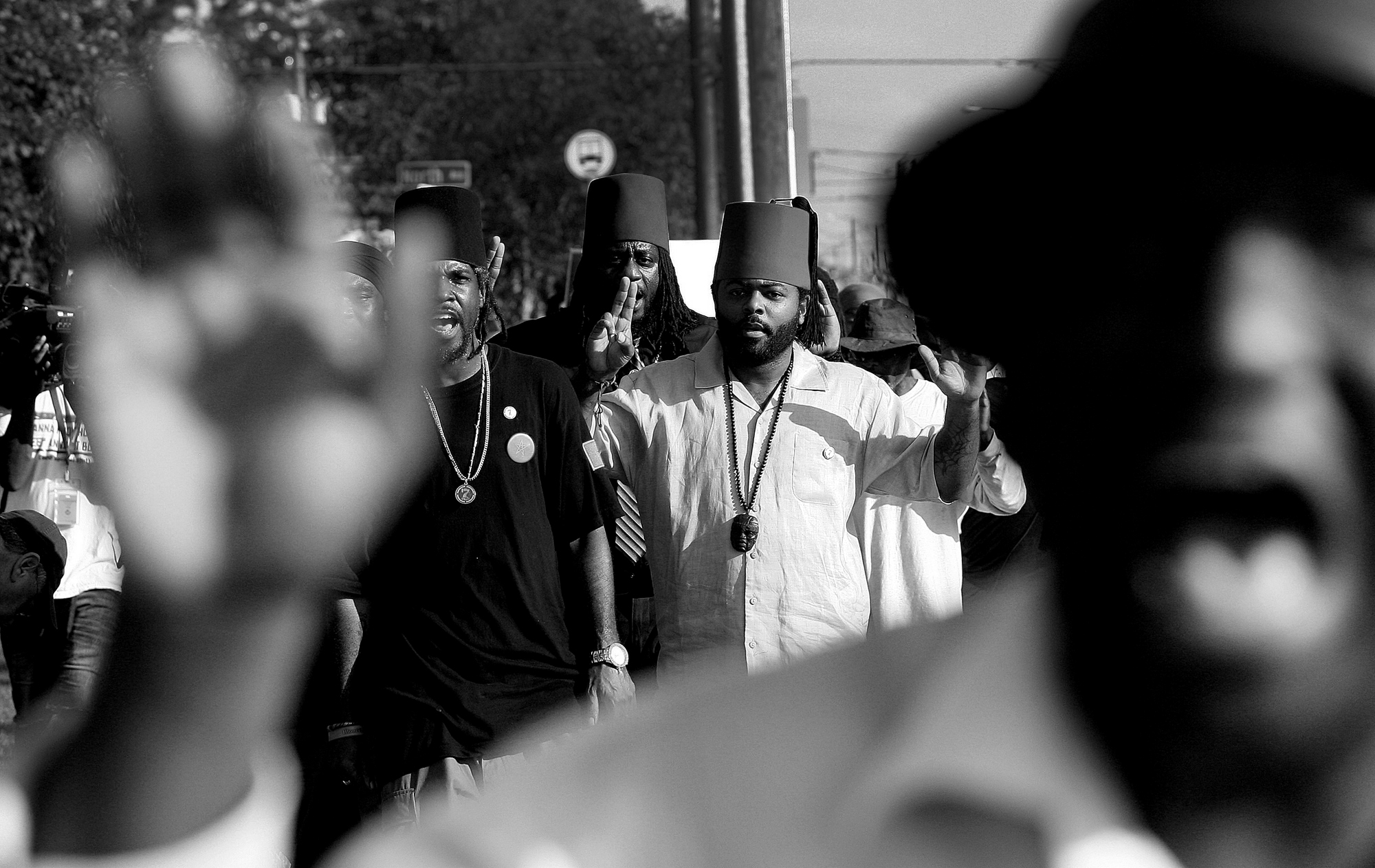 –General News HM: Rob Ostermaier/Daily Press–Khori Allende-El of the Moorish Science Temple of America marches with about forty peaceful protestors up Jefferson Ave. to the Newport News Police headquarters. The march was held to draw attention to the situation in Ferguson, Missouri and to gun violence in general.