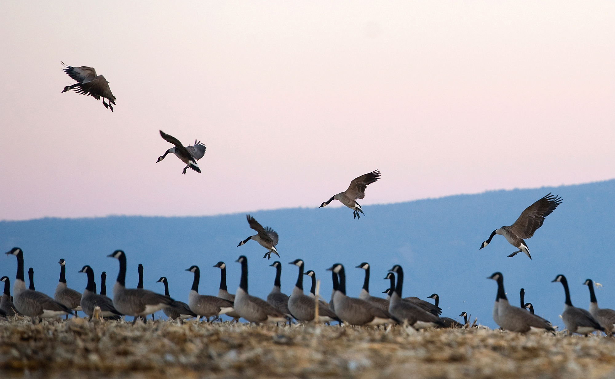 Pictorial HM: Nikki Fox/Daily News-Record Published June 1, 2015 at 2000 × 1232 in The 2014 VNPA Photo Contest Winners Gallery: Singles –Pictorial HM: Nikki Fox/Daily News-Record–A flock of Canadian geese settle down for the evening north of a Harrisonburg, Va., cornfield as Massanutten Mountain looms in the background on Feb. 11, 2014.