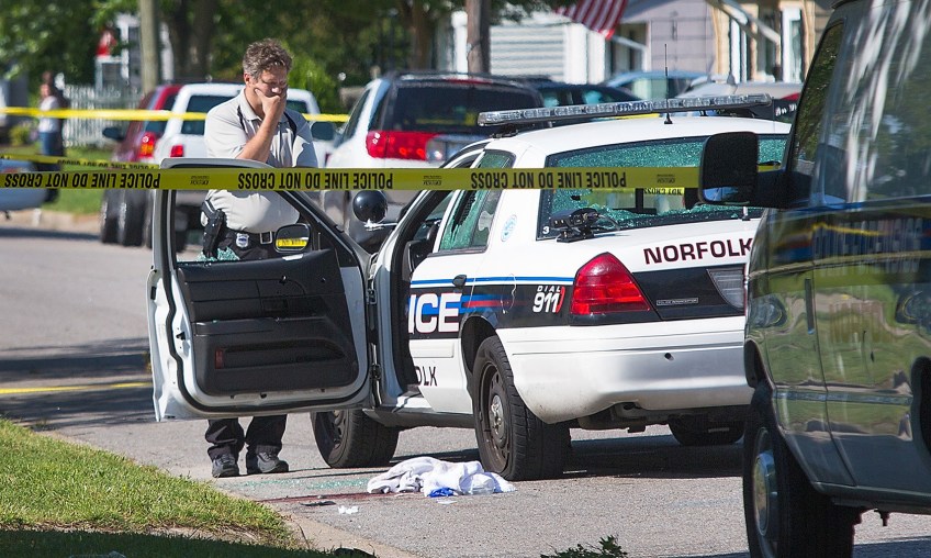 –Spot News 1st Place: Hyunsoo Leo Kim/The Virginian-Pilot–A Norfolk police pauses next to police vehicle as he investigates the scene of shooting where Norfolk Police Officer Brian Jones was killed in the line of duty late Friday, at the 7400 block of Wellington Road in Norfolk, Va. 2014.