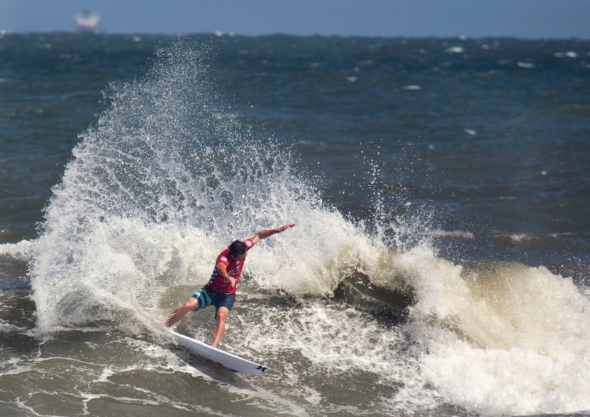 Michael Dunphy kicks up a wall of spray as he cuts back on a wave during the Vans Pro Final today Aug. 24, 2014 at the 52nd Annual Coastal Edge East Coast Surfing Championships (CE-ECSC) presented by Vans at the Virginia Beach oceanfront. Michael who is from Virginia Beach, Virginia won the event. (L. Todd Spencer / The Virginian-Pilot)