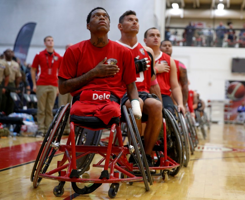 The Marine Corps wheelchair basketball team listens to the national anthem before taking on Army in the gold medal match. The Marines defeated Army for the gold medal at the 2014 Warrior Games in Colorado Springs, Colorado, on Friday, October 3, 2014.
