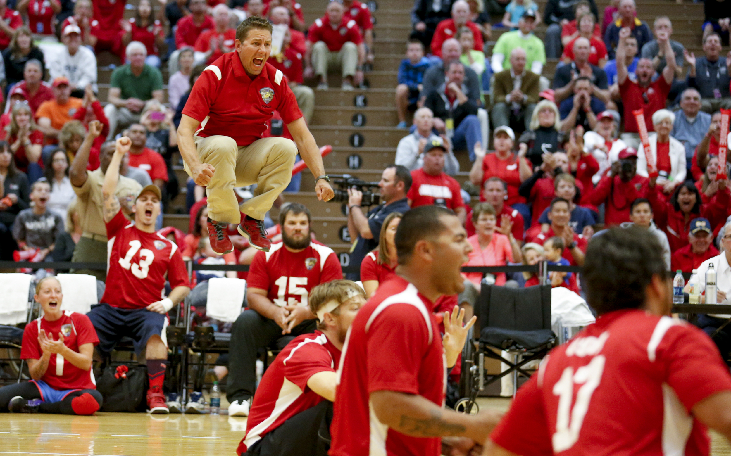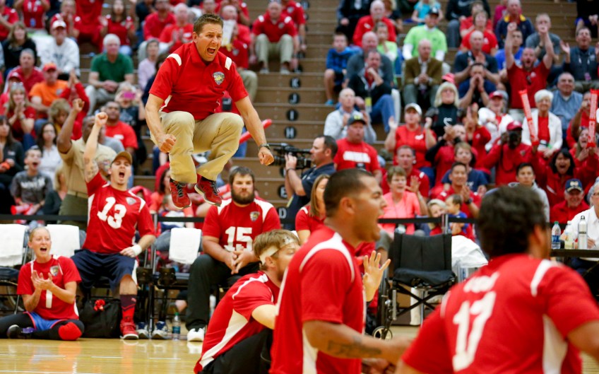 Marine Corps volleyball coach Brent Petersen gets excited as the Marines close within a point of beating Navy in the first game of Thursday’s gold-medal match. Navy defeated Marine Corps 2-1 to win the gold medal at the 2014 Warrior Games at US Olympic Training Center in Colorado Springs, Colorado, on Thursday, October 2, 2014.