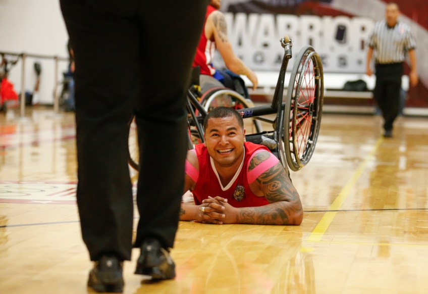 Warrior Games Published June 1, 2015 at 2500 × 1716 in THE 2014 VNPA PHOTO CONTEST WINNERS GALLERY: Sports Picture Story Staff Sgt. Jorge Salazar looks to a referee after falling during the Marine Corps-Army wheelchair basketball game at the 2014 Warrior Games on Wednesday, October 1, 2014. Marine Corps beat Army to remain undefeated.