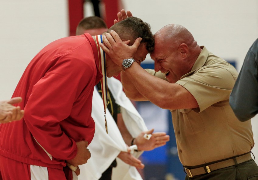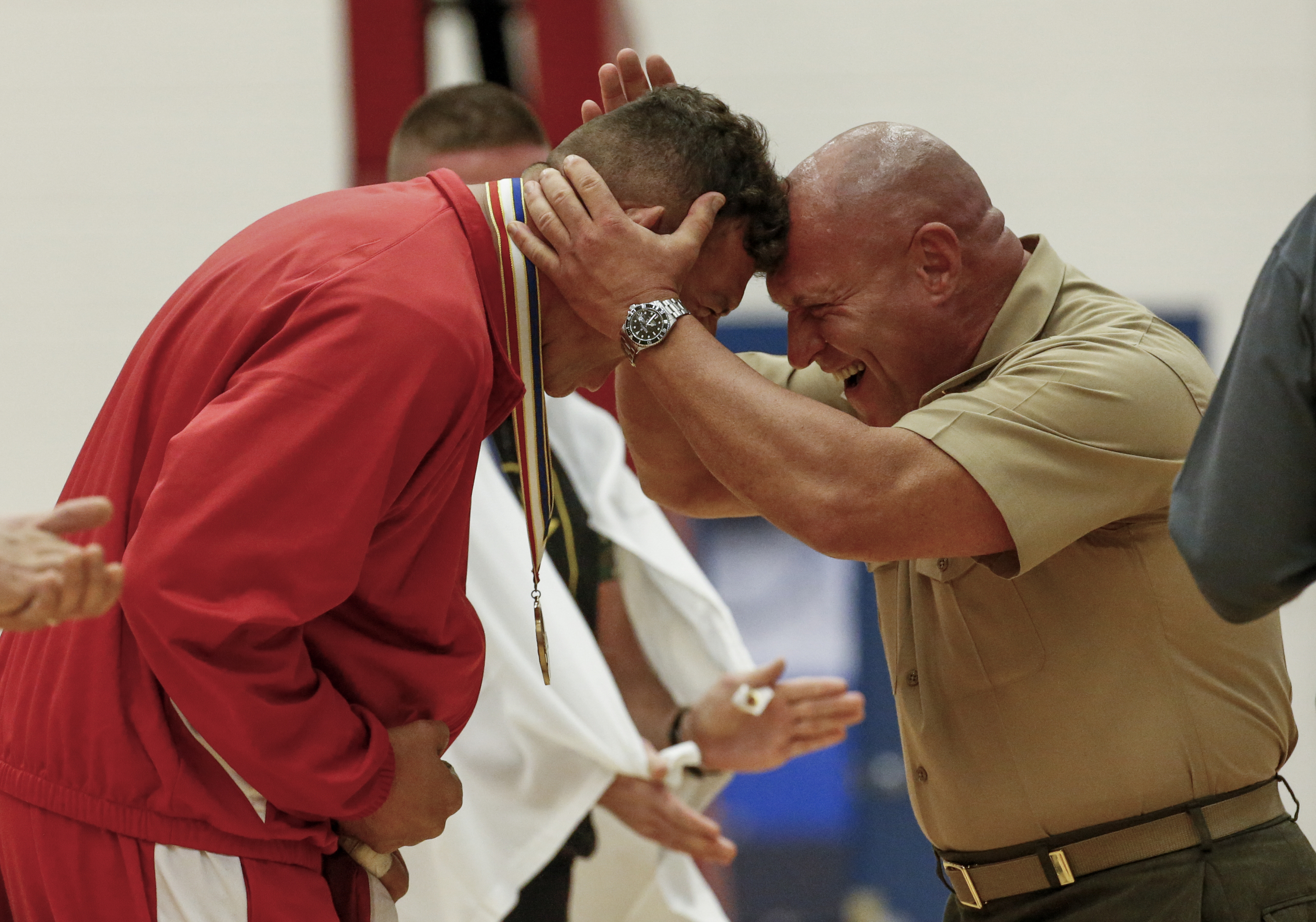 Col. Shane Tomko, commander of the Wounded Warrior Regiment, congratulates Adam Vickers, gold medalist in the men’s recumbent cycling race at the 2014 Warrior Games at the US Olympic Training Center in Colorado Springs, Colorado, on Monday, September 29, 2014.