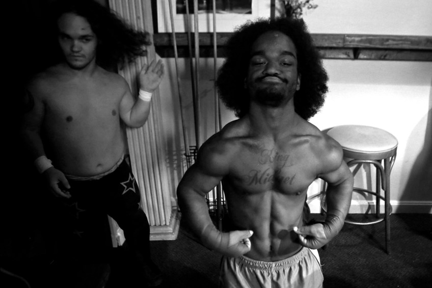Sports Picture Story HM: Jonathon Gruenke/The Daily Press Published June 1, 2015 at 2000 × 1334 in THE 2014 VNPA PHOTO CONTEST WINNERS GALLERY: Sports Picture Story –Sports Picture Story HM: Jonathon Gruenke/The Daily Press–Wrestlers prepare backstage at Cozzy’s Comedy Club before performing in the Extreme Midget Wrestling Federation.