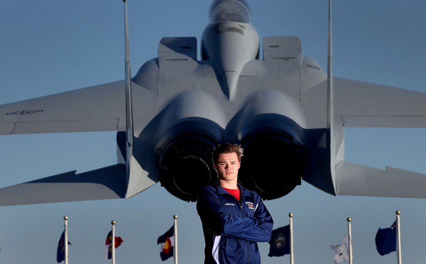 Athletes Of The Year Published June 1, 2015 at 2000 × 1239 in THE 2014 VNPA PHOTO CONTEST WINNERS GALLERY: Sports Picture Story Grafton swimmer Jonathan Spires is photographed with an F-15 Eagle on display at Langley Air Force Base. The F-15 is a twin-engine, all-weather tactical fighter that went into service in the 1970’s.