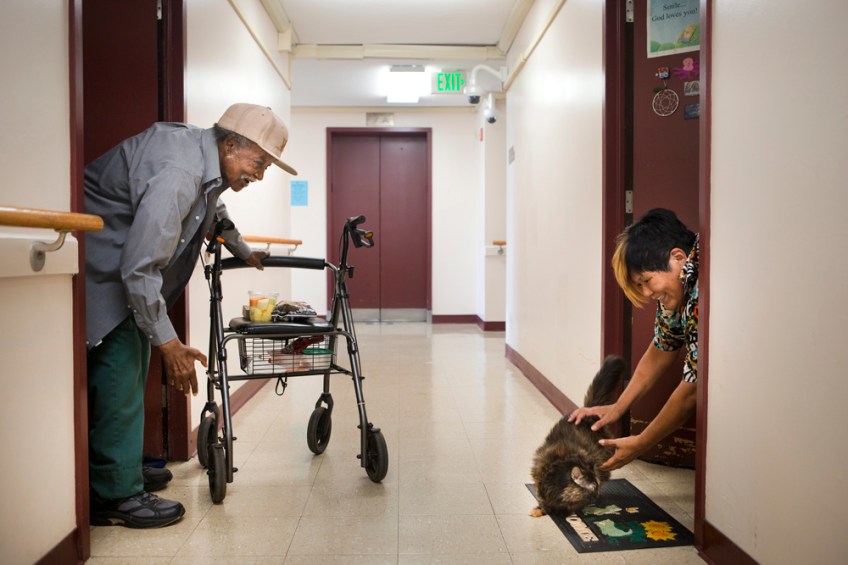 James Lee Britt, 77, bends down to say hello to Janine Vandenberg’s cat, One Sock, and chats with Vandenberg before he heads back into his apartment at Melrose Towers on Wednesday, June 17, 2015. Britt had just returned from picking up some food items downstairs at the weekly food delivery through the Joint Residents Council of the Roanoke Redevelopment and Housing Authority and the Melrose Towers Council. Fitted with dentures last month after not wearing any for 15 years, Britt says he is more social now and talks more with his neighbors and friends. “I thought they would forget the poor people, but they’re not. That’s why I’m kind of speechless. I’m getting everything that I didn’t get before. And I’m happy about it,” Britt said.