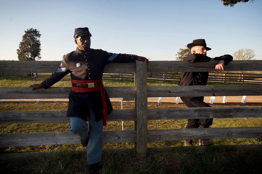 Multipe 1st Place: Jill Nance/The News & Advance Published August 31, 2015 at 1000 × 665 in VNPA 2nd Q. Clip Contest Color Sergeant Larry Harris (left) and Michael Schaffner with the 41st U.S. Color Troop watch the National Historical Park’s “Footsteps to Freedom” program on Saturday night.