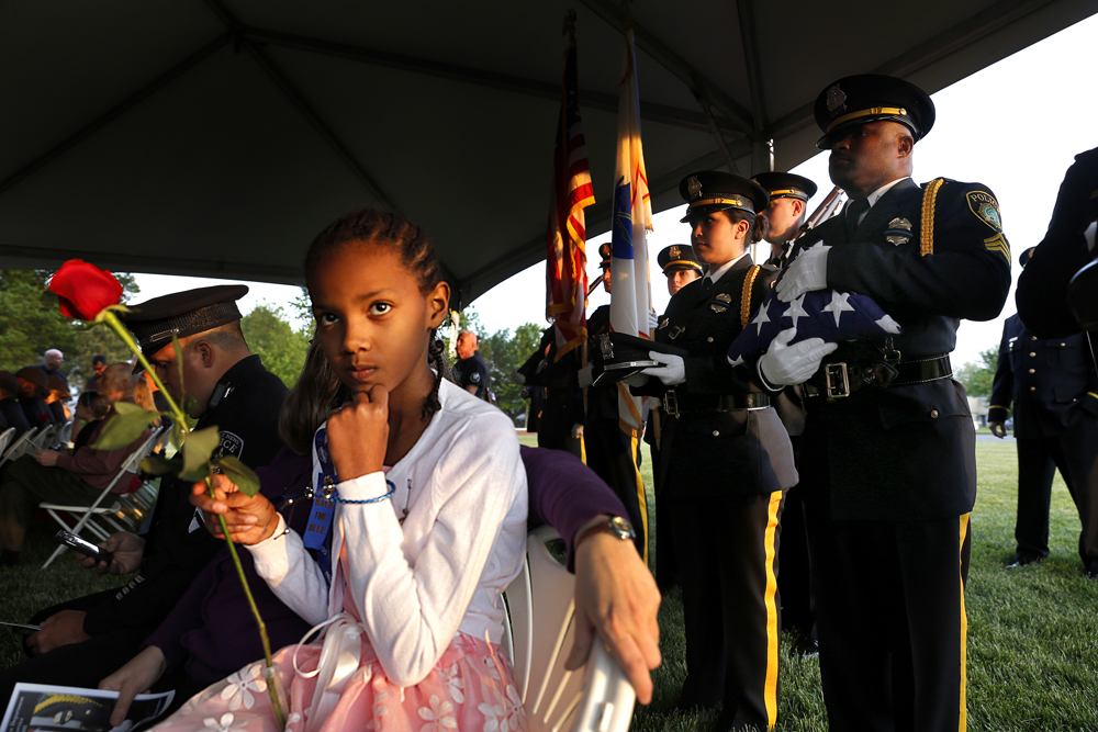 News 2nd Place: Jonathon Gruenke/Daily Press Published August 31, 2015 at 1000 × 667 in VNPA 2nd Q. Clip Contest Maya Mercer, left, holds a rose as Newport News police officers wait to place the Flag, Boots and Hat during Thursday’s candlelight memorial service to remember the 11 police officers who have died on duty and to honor those who serve today.