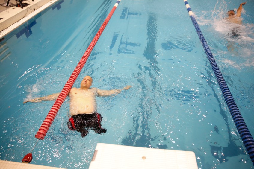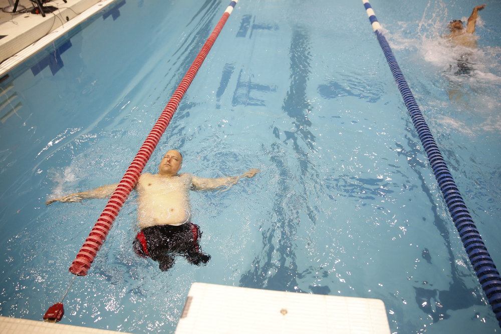 Team Marine’s Chuck Sketch competes in the 50-meter backstroke during the 2015 Warrior Games at Freedom Aquatic Center in Manassas, Va., on Saturday, June 27, 2015. Sketch is blind and had both legs amputated and competed in swimming, cycling and shooting.