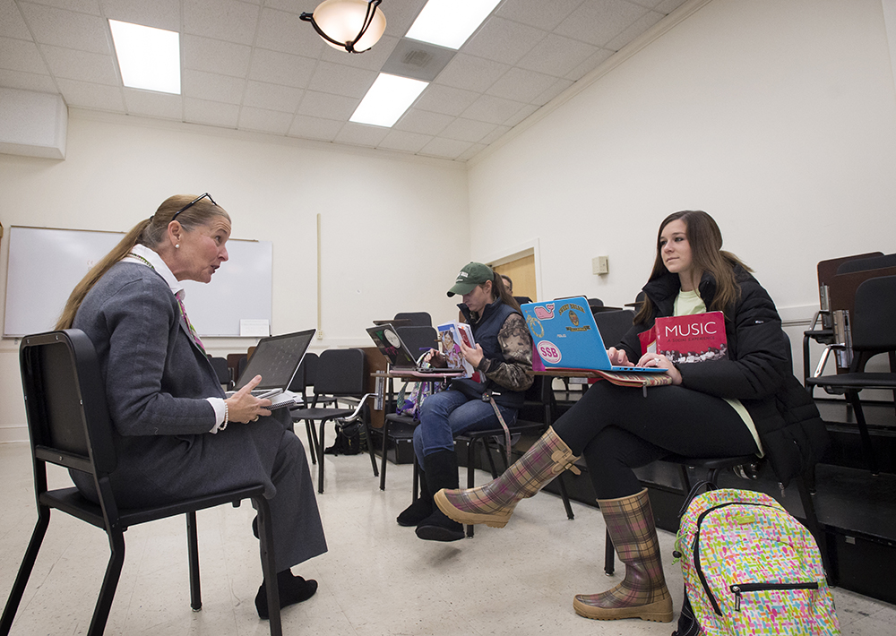 Marcia Thom-Kaley teaches her music appreciation class to Katie Fisher (left) and Hallsey Brandt. Thom-Kaley recently took the girls, a class size of two, to a concert in Roanoke to experience live music. With only around 250 girls returning to the school, the class size on campus is even smaller than before.