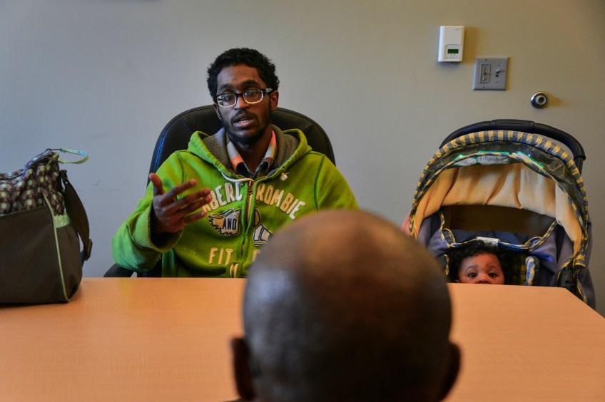 With his daughter, Sapphire, curiously looking on, Paul Gayle explains to social worker Alphonso Pettis about being thrown out of his mother’s house after a disagreement. At 19, he possessed what few other black men in his neighborhood did: He was among the 42 percent with no criminal record; the 35 percent with a high school diploma; and the 14 percent of fathers who lived with their child. “A master at barely avoiding disaster,” his mother said of him, but she had said the same thing about Paul’s father until he was shot and killed during an argument at 39, when Paul was in eighth grade.