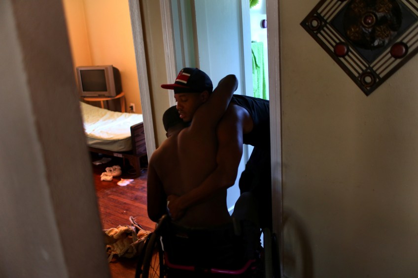 Dexter Tillery lifts up his cousin Edward Miller taking a shower on Oct. 2, 2013. Simply using a bathroom for Edward is a challenging task for the family. ÒEverything now is much slower. You have to wait a lot of time on other peopleÕs time,Ó Edward said of being helped on his daily activities.