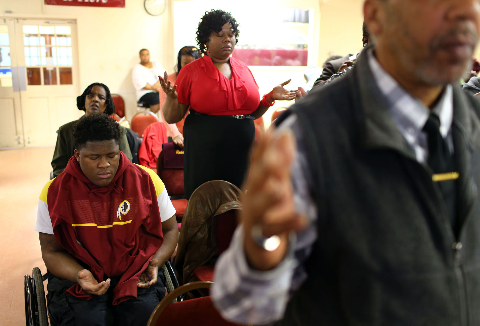 Edward Miller, (17 in 2014) left, prays with his mother, Lawanda Booker, standing next to Edward, during a church service at Crusade for Christ Christian Church Ministries in Richmond on Sunday, March 2, 2014. Edward often recites the note from his sister, Shakiria Miller, ÔGod gives his hardest battles to his strongest warriors.Õ ÓThatÕs what got me through physical therapy, those hard days and me passing out and stuff like that. ThatÕs what got me through that hard time,Ò Edward said of the note.
