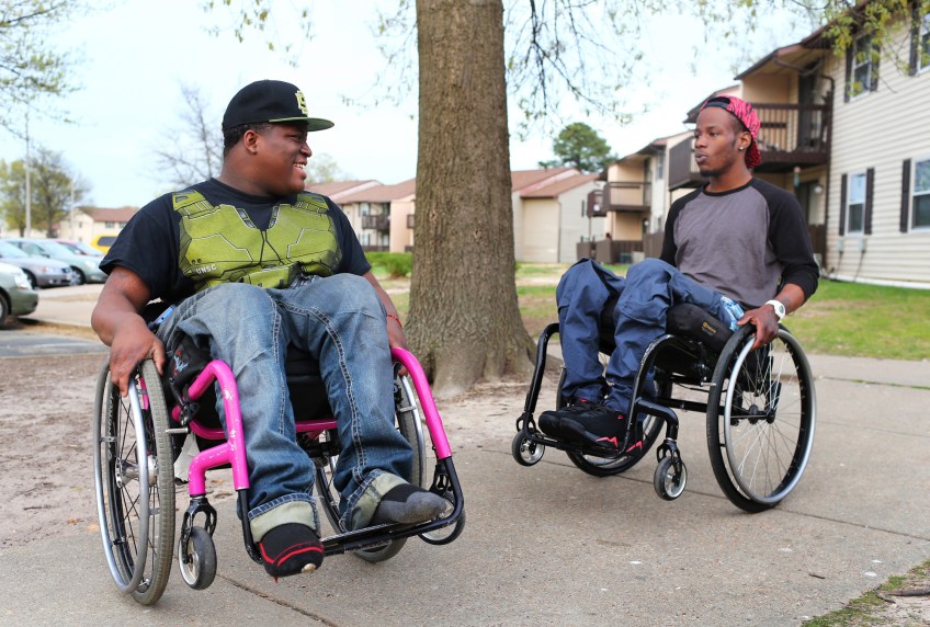 Edward, left, and Andre Seabrook, show off what they can do with their wheelchairs as Edward visits his friend, Andre, in Richmond on Monday, April 14, 2014. They met each other at VCU rehabilitation center as they both were shots on the same day but not related crimes, which caused paralysis for both from their waist down. ÒWhen I heard his story, it made me feel better about my story. So I wonÕt be the only one going through my situation, ÒEdward said of Andre.