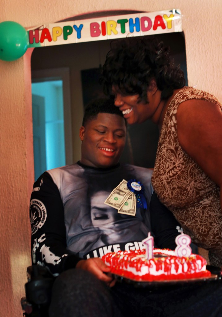 Edward Miller and his mom, Lawanda Booker, share a smile on Edward’s 18th birthday at their home in Richmond on Jan. 31, 2015. Lawanda said she is grateful for God that Edward made his 18th birthday after all of struggles after the shooting. Booker said, ÒToday is a day of celebration for me and Edward.Ó