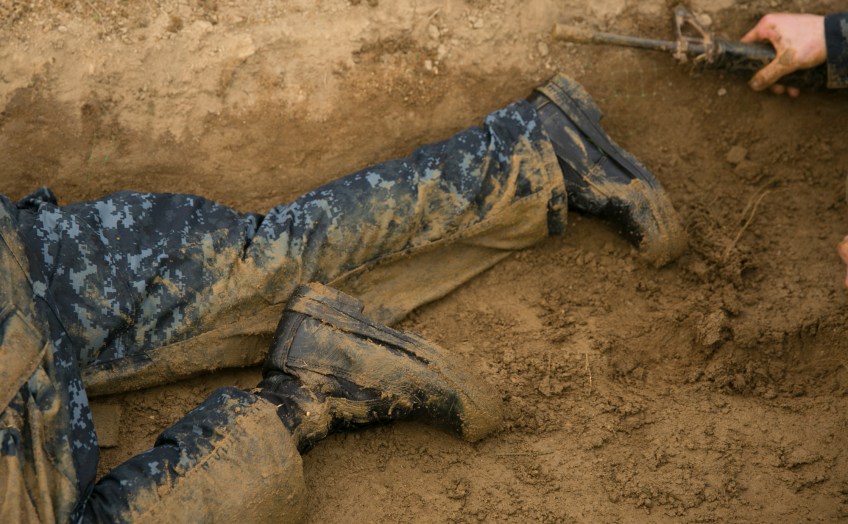 Plebes negotiate a low-crawl obstacle during the annual Sea Trials exercise at the U.S. Naval Academy in Annapolis, Md., on Tuesday, May 12, 2015. The event, modeled after the Marine Corps’ Crucible and Navy’s Battle Stations events, runs over 14 hours and tests the plebes’ physical and mental endurance.