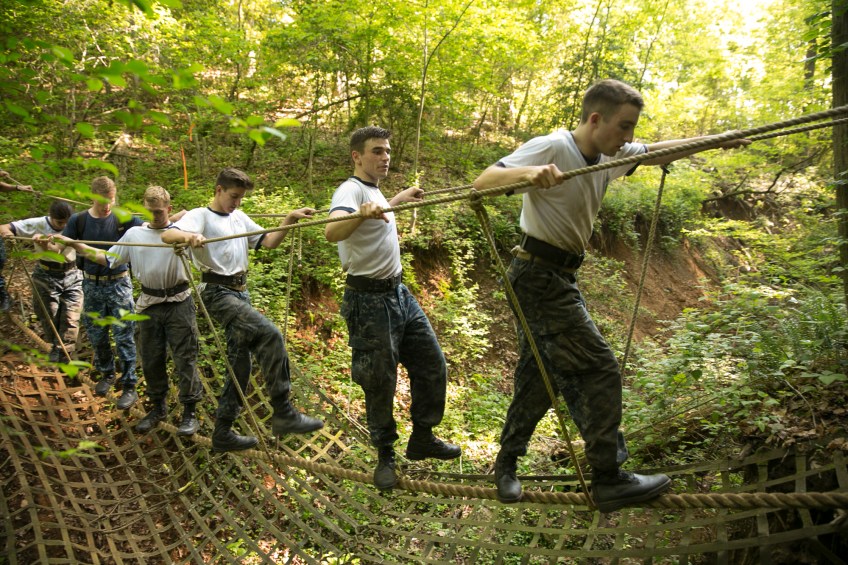 Plebes cross a rope bridge during the annual Sea Trials exercise at the U.S. Naval Academy in Annapolis, Md., on Tuesday, May 12, 2015. The event, modeled after the Marine Corps’ Crucible and Navy’s Battle Stations events, runs over 14 hours and tests the plebes’ physical and mental endurance.