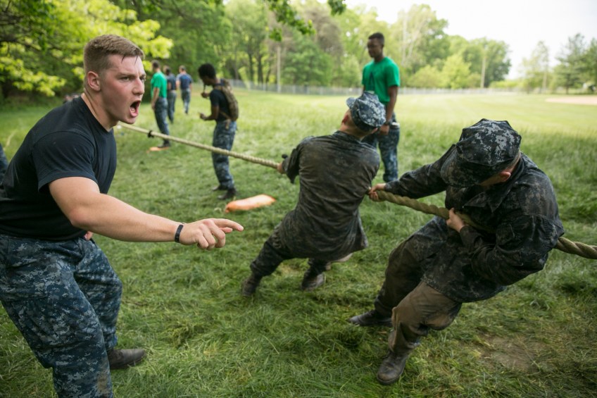 Midshipman 2nd-class Zach Coffman, of Charlottesville, Va., encourages plebes during the tug-of-war at the annual Sea Trials exercise at the U.S. Naval Academy in Annapolis, Md., on Tuesday, May 12, 2015. The event, modeled after the Marine Corps’ Crucible and Navy’s Battle Stations events, runs over 14 hours and tests the plebes’ physical and mental endurance.