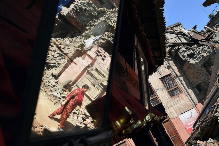 nps-020-earthquake03 Published March 6, 2016 at 2000 × 1332 in 2015 VNPA Contest: News Picture Story Damage from the earthquake is visible as a woman is reflected in a mirror as she walks near Bhaktapur Durbar Square on Saturday May 02, 2015 in Bhaktapur, Nepal.