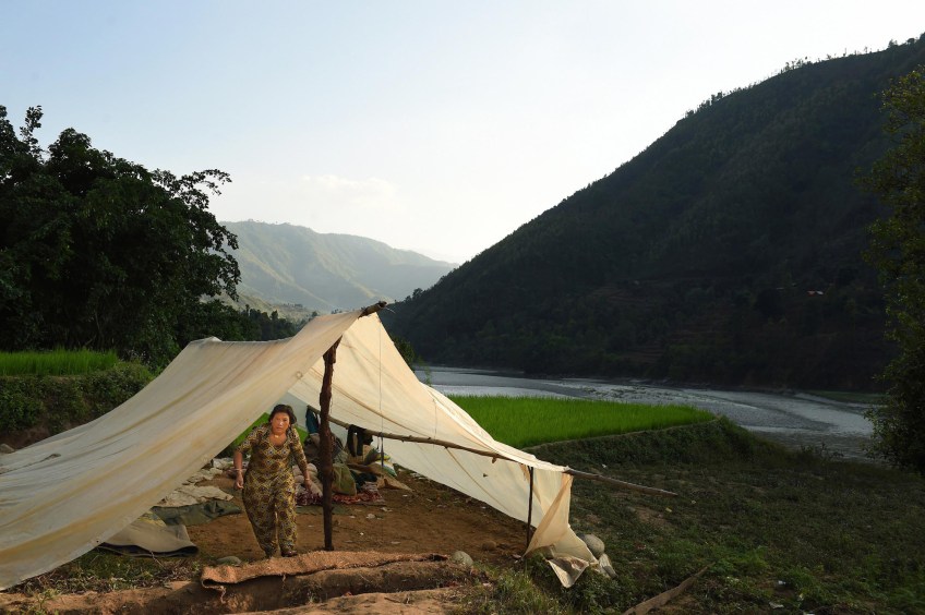 A woman walks out of a tent nestled in a scenic spot on Sunday May 03, 2015 in the Nuwakot District of Nepal. A deadly earthquake in Nepal killed thousands. Tent encampments are a common sight as people have lost their homes or are afraid to return to them because of earthquake damage.