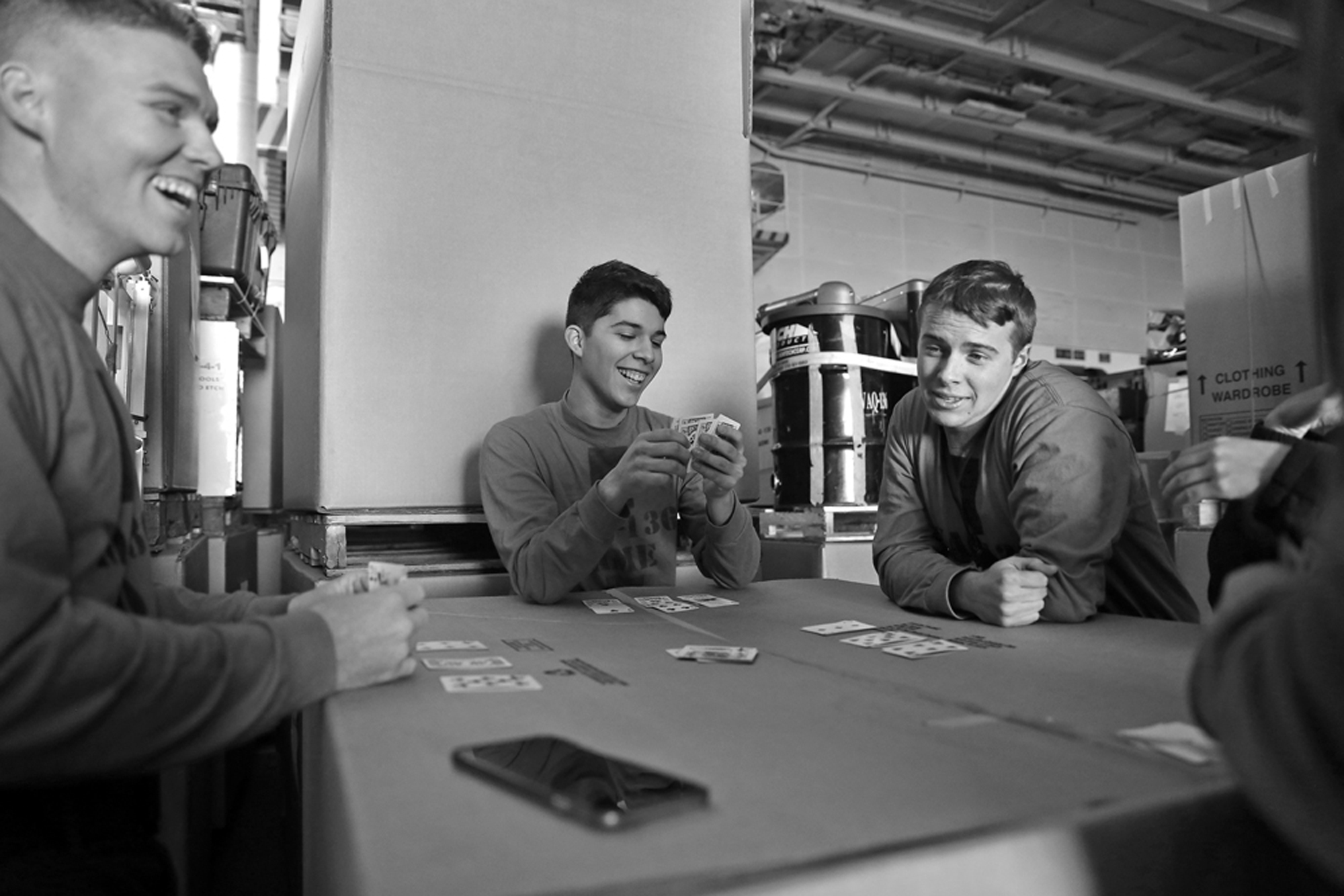 AD-3 Jonathan Woodell, left, Amean Ruben Morones, center, Amean Chase Allen, right, and other USS George Washington service members play cards Wednesday afternoon in the hanger bay. The USS George Washington is returning to Naval Station Norfolk following it’s deployment in Japan Thursday December 17, 2015.