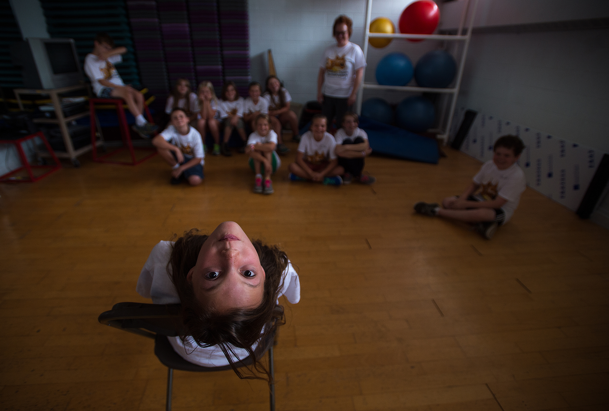 feature_HM_01 Published March 6, 2016 at 2000 × 1352 in The VNPA 2015 Contest Winning Singles HM FEATURE: Autumn Parry, News & Advance–Erin Alburger, 11, participates in a staring exercise as the students learn how to become clowns during Randolph’s WildCat Theatre Conservatory at Randolph College in Lynchburg, Va.