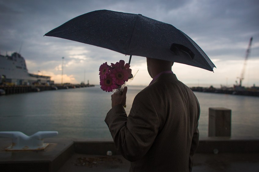 2nd PLACE GENERAL NEWS: Hyunsoo Leo Kim, Virginian Pilot—“It’s great to have her home.” Even before the giant white ship with a big red cross on each side pulled into view, Lt. Col. Greg Hoffman stood out front on the rainy pier under an umbrella, wearing an elegant suit and holding a bouquet of pink flowers. He’s a Marine with 26 years of service. His wife, Lt. Cmdr. Beth Hoffman, is a Navy nurse at Portsmouth Navy Medical Center and was selected for commander on this deployment. In the decade since they got married, they’ve both deployed so many times – including several combat tours – that they’ve been apart as much as they’ve been together, Hoffman said.