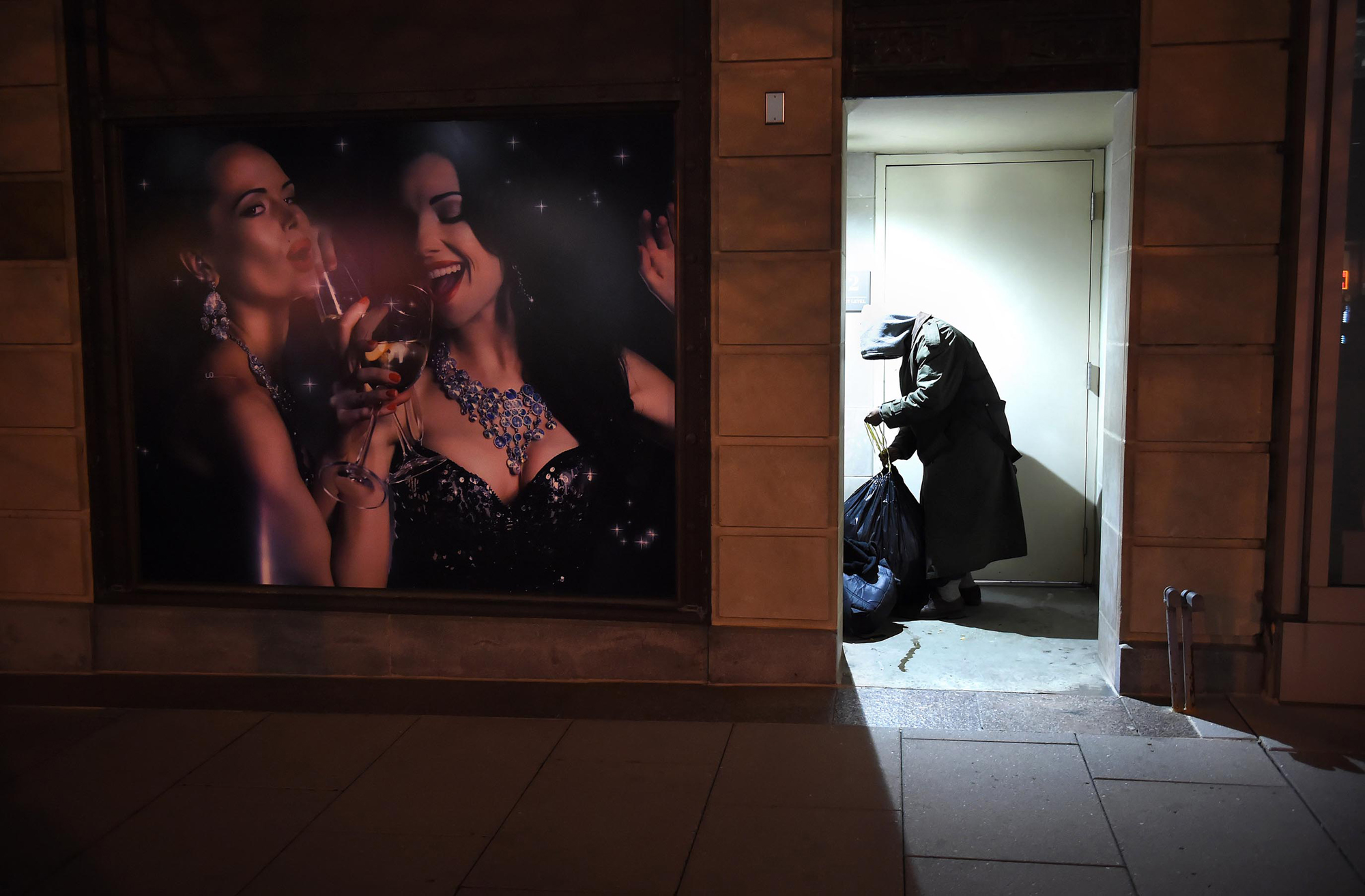 lifestyle_01 Published March 6, 2016 at 2000 × 1313 in The VNPA 2015 Contest Winning Singles 1st PLACE LIFESTYLE: Matt McClain, Washington Post—A man gathers up his belongings next to a photograph promoting a new luxury restaurant along 15th St. NW on Monday February 2, 2015 in Washington, DC.