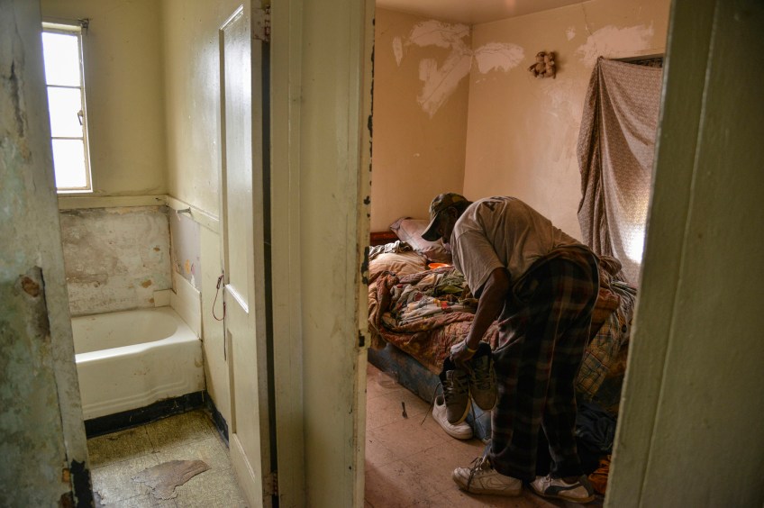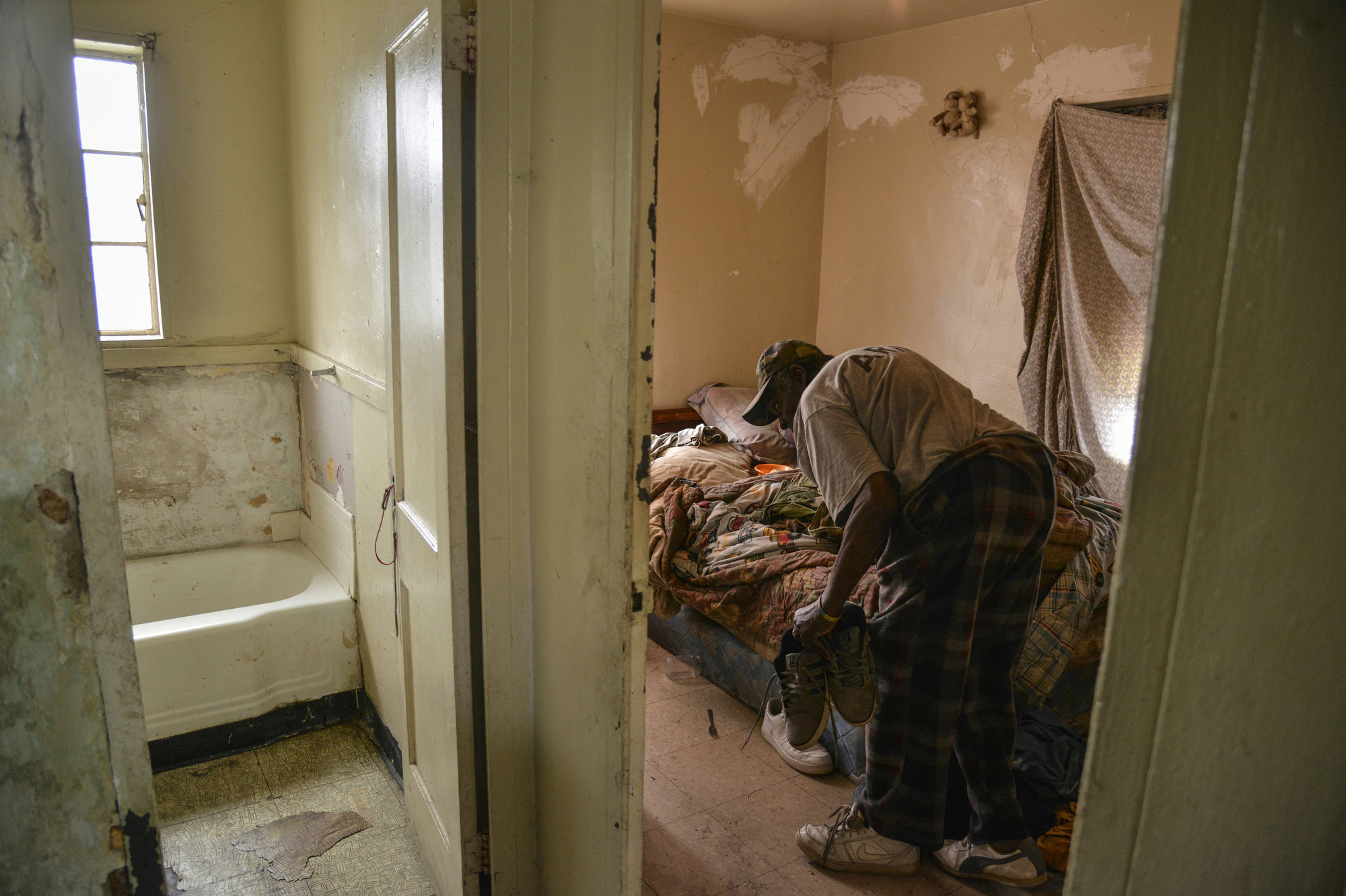 3rd PLACE LIFESTYLE: Jahi Chikwendiu, Washington Post—John Johnson, 73, prepares to rest in his rented home of the Minnie B. Anderson Homes neighborhood, a dilapidated housing complex adjacent to the former Craig Air Force Base in Selma, AL. These units, mostly vacant and ransacked, were residences for Craig AFB personnel but were converted to low-income housing after the base closed in 1977. President Barack landed at the base next to the complex and drove past en route to deliver remarks in commemoration of the 50th anniversary of Bloody Sunday.